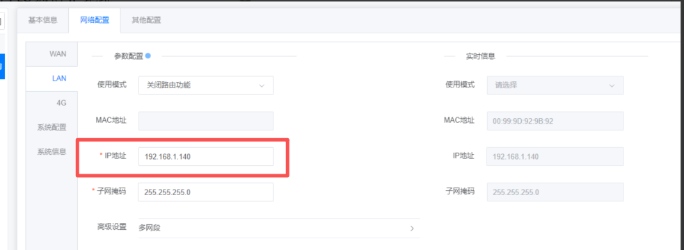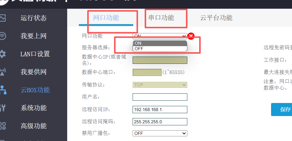 网口功能和串口功能设置OFF,以免长时间不连公网导致重启。