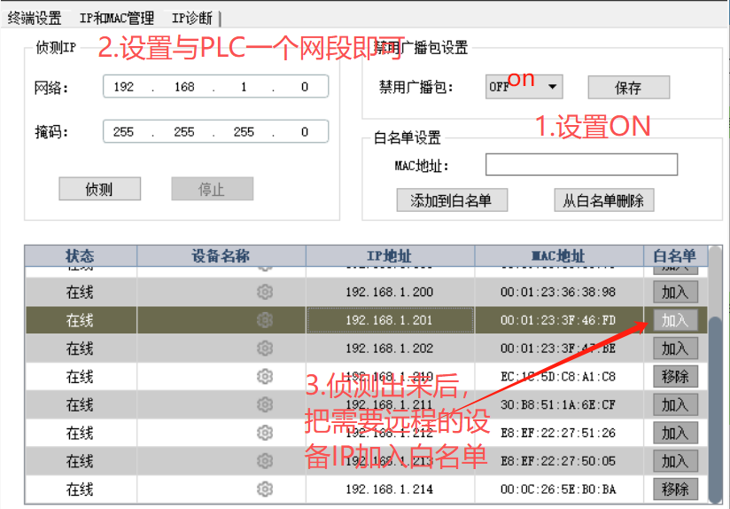 此时,需要禁用网关广播包,并通过侦测设备加入白名单的方式进行优化连接。